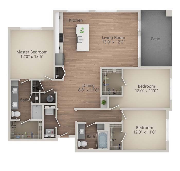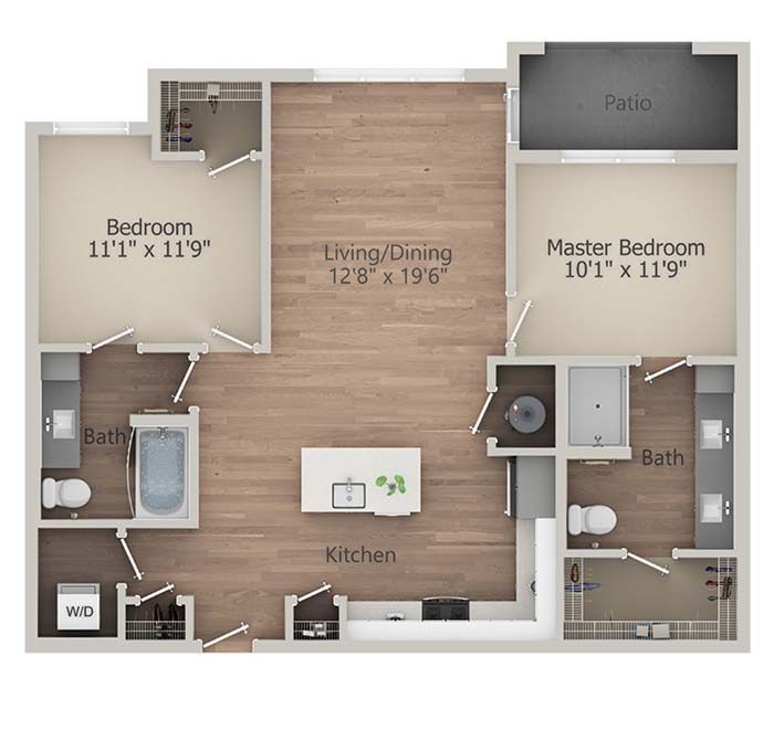 - Unit features: Open floor plan, gas range, pantry, garden tub, quartz countertops, built-in shelves and desks (select units)