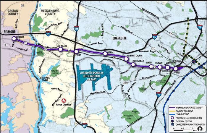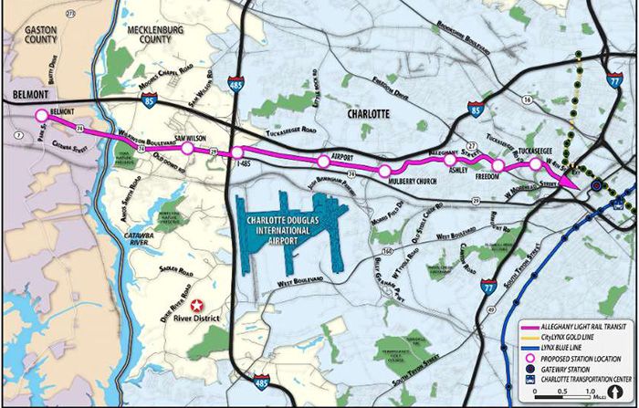The first option would run light rail through the heart of Wesley Heights on its way west of Uptown, following Freedom Drive in places before cutting a path between I-85 and Wilkinson Boulevard. After reaching the airport, the line would continue through to the north of the future River District and over the Catawba into the town of Belmont.
