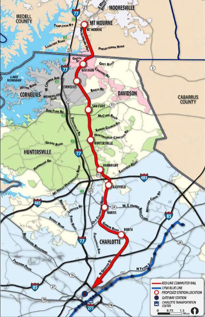 The first option is similar to the Red Line that’s been talked about for years. It would bring commuter rail through downtown Huntersville, Cornelius and Davidson — which is a big deal. But it also would take an agreement with the Norfolk Southern railroad company, and they’ve basically said no.