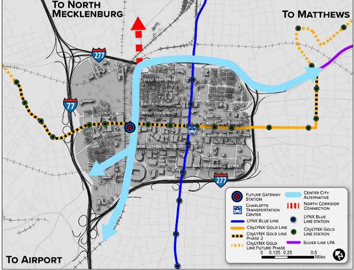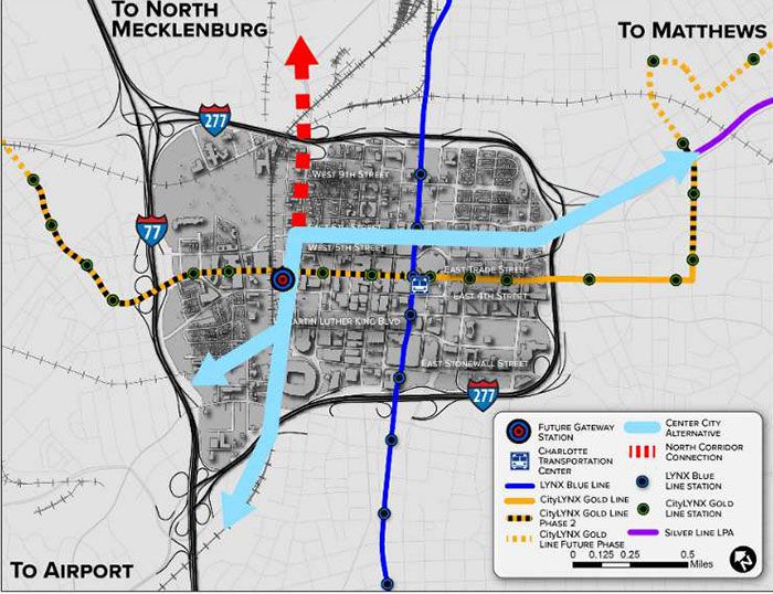 The first option uses the existing Blue Line in Uptown and the Charlotte Transportation Center to get people from one train to another.