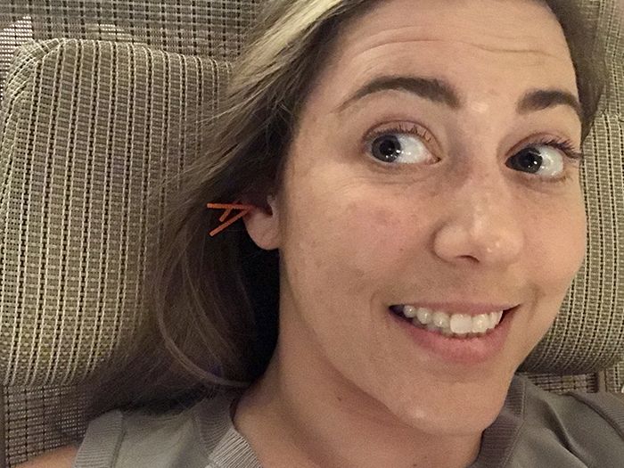The hardest part of the whole experience was trying to sit still for 30 minutes. I even knocked out a needle while trying to take this selfie: