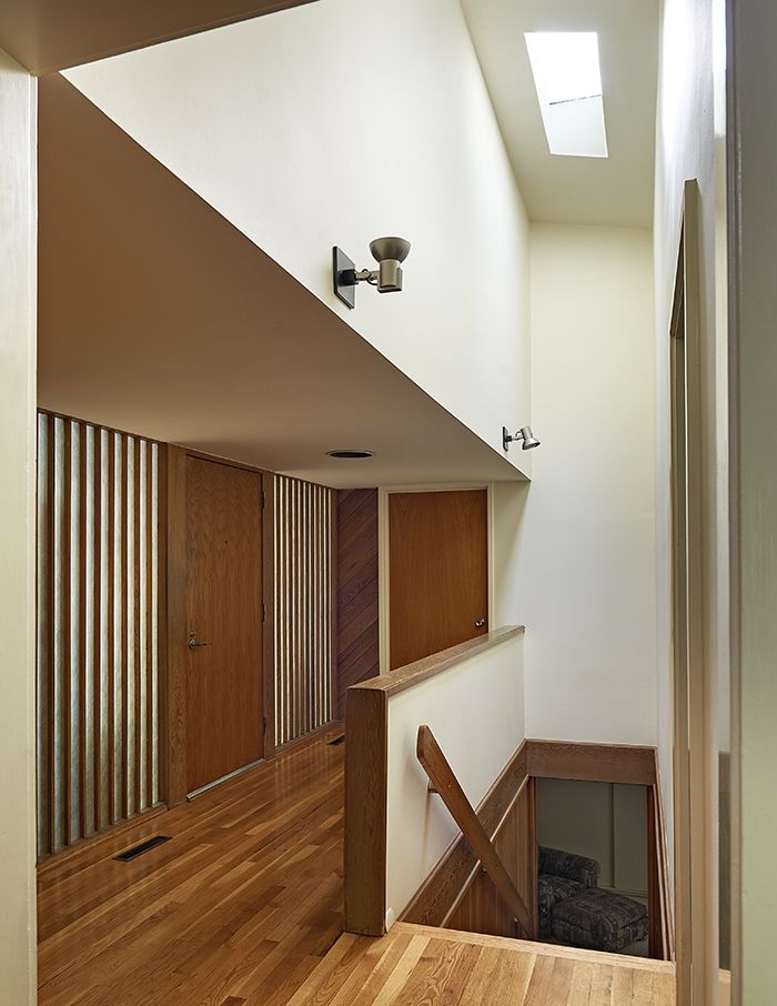 Features: Horizontal windows, overhanging eaves, original light fixtures