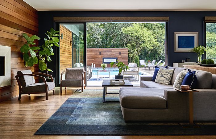 Features: Low-pitched roof, exposed beams, expansive glass, custom floating bookcase