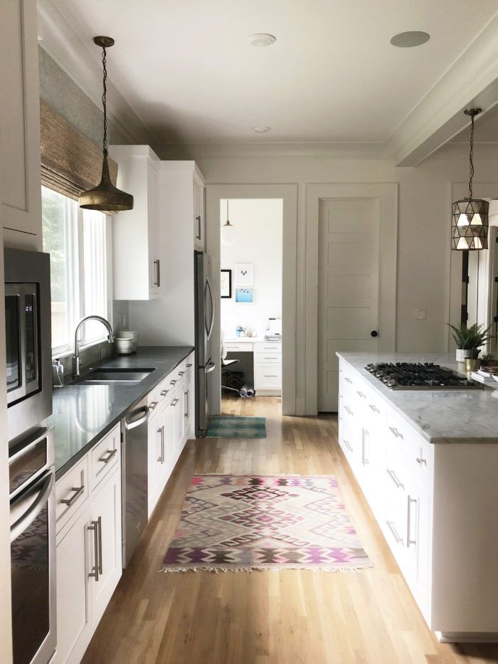 Bright Side: Much of the home’s color comes from its art and rugs. Many of the rugs are Lulu & Georgia, but the vintage ones in the kitchen and entry way are both from Plaza Midwood’s Slate Interiors. Most of the home’s art is from the online site, Minted, but you can also find pieces like the seaside photo above the fireplace at Urban Outfitters.