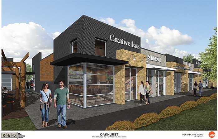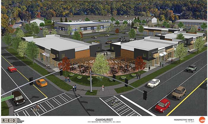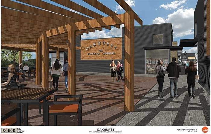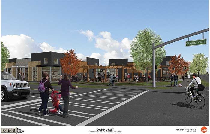In the works since at least 2010, Oakhurst on Monroe is at the intersection of Monroe Road and Chippendale Avenue, right across the street from the Oakhurst STEAM Academy and kitty-corner from the Common Market.