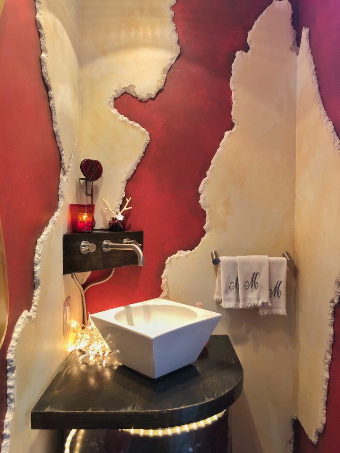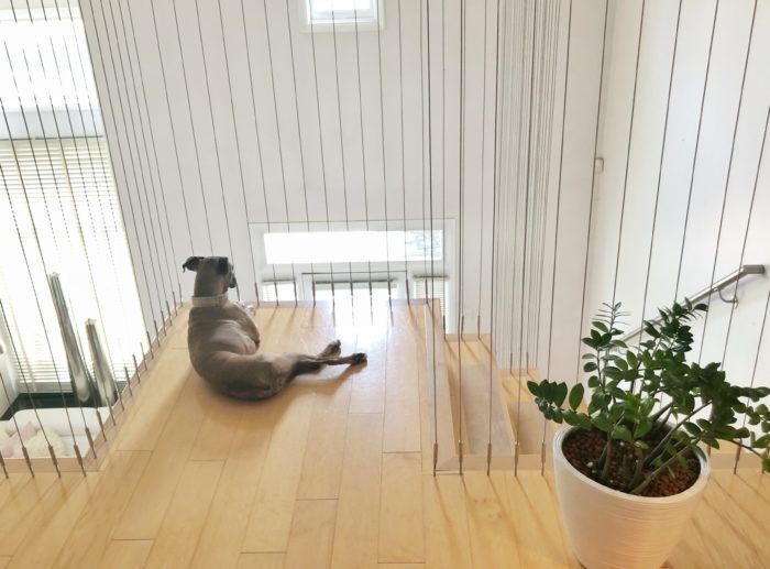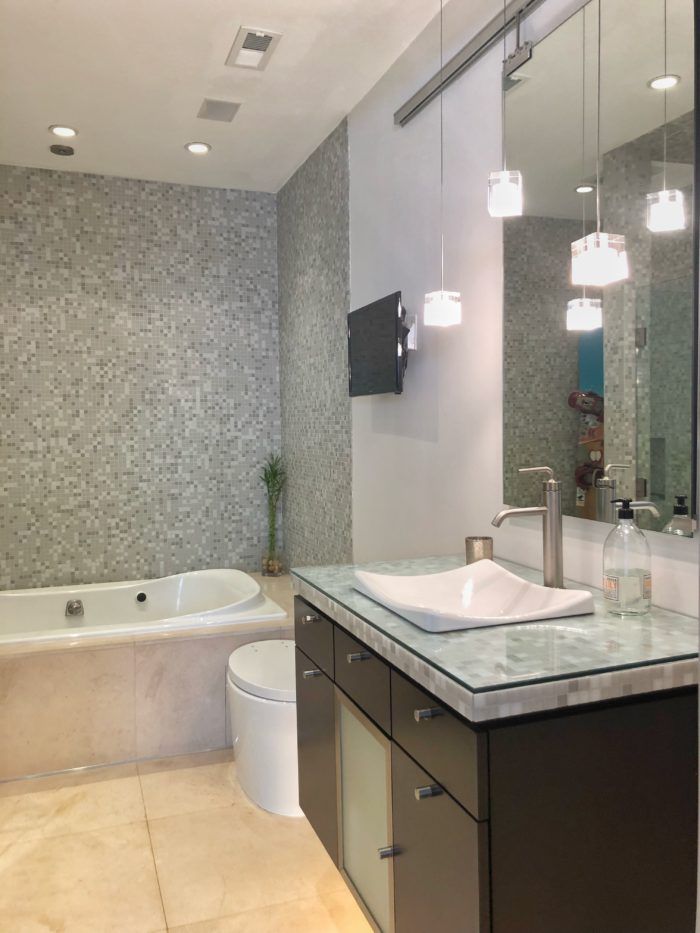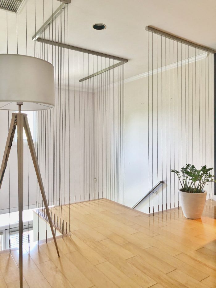 She opened up the kitchen, adding a gas stove and stone floors. And in the ground floor master bedroom she removed closet space to turn her bathroom into a spa-like experience with an oversized tub, rain shower, and heated floors. Her latest project was her staircase, which was created by Southern Staircase and features small cables from the floor to the 20-foot ceiling along its entire edge.
