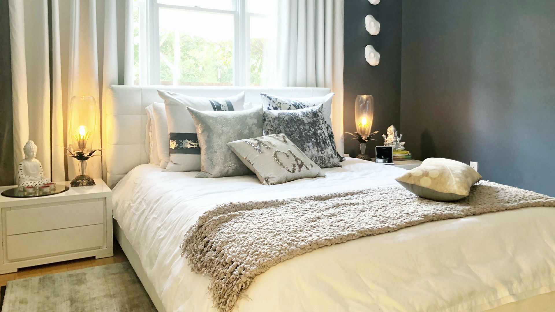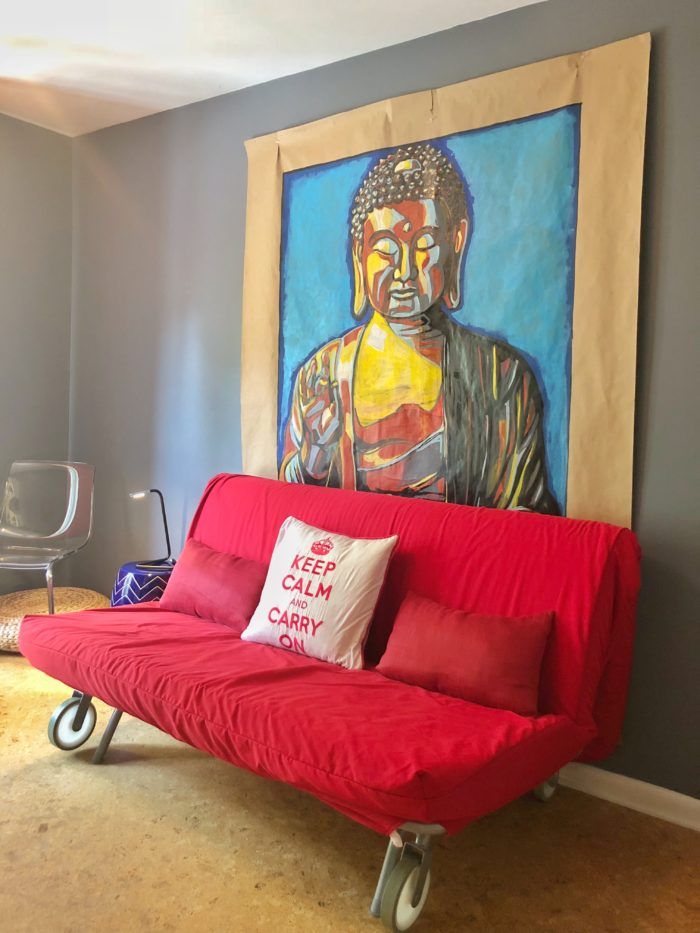 Feeling Zen: “I like the teachings of Buddhism,” says Nessbach, who meditates and practices yoga. Nods to this are found throughout the home including an oversized Buddha painting in one of the upstairs bedrooms and small Buddha statues on her living room shelves. “It reminds me to stay grounded and be present.”