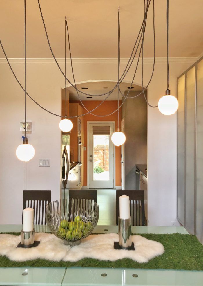 Treasure Hunting: “For accessories I like to go to little stores that are off the beaten path—like Magnolia Emporium,” says Nessbach. The living room’s poof is from Jaipur, the coffee table and chair are from Design Within Reach, and the couch is from Mobital. IKEA items can also be found through the home including the bedroom closet, kitchen cabinets, and dining room cabinets. The dining room also features a light fixture that is hand blown glass from Sklo and a cuckoo clock on the wall that is a modern version from Germany. “It’s my one German thing,” says Nessbach.