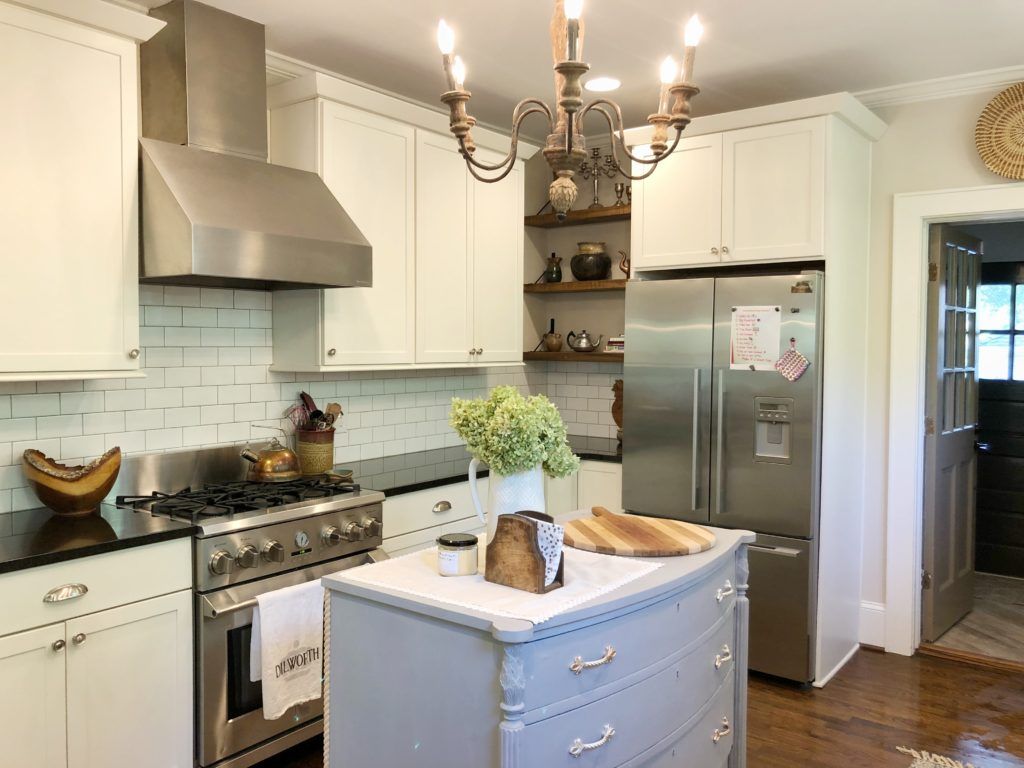 Mix It Up: “I love to mix luxury fabrics or tiles with things that are more reasonable,” says Laura, who also has an eye for mixing contemporary and antique furnishings. Items like the vanity in her bedroom are from West Elm, and the chairs and rug in the living room came from Details on Park Road. But many of the home’s accessories are from antique shops and estate sales.