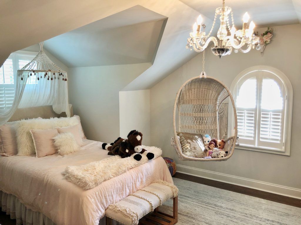 Big Ideas: Laura says that she likes to find out-of-the-box inspiration from places like Pinterest or HGTV. You’ll see this in whimsical touches like a porch swing from Pier 1 hanging from the ceiling in her daughter’s room, but also in stylish additions like the cement tile in the upstairs bathroom. “I got that idea off of Pinterest,” she says of the tile she purchased at The Tile Shop. “And Joanna Gaines always uses tile like that.”