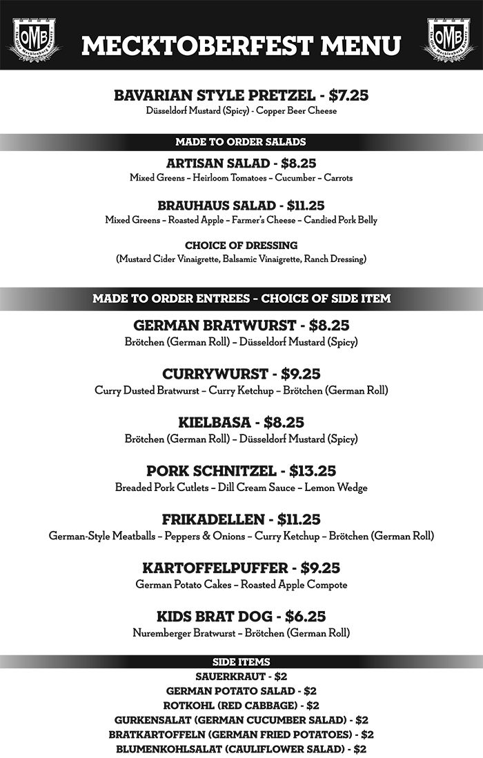 A larger menu than in years prior, items include OMB staples like the Bavarian Style Pretzel (with Düsseldorf Mustard or Copper Beer Cheese, $7.25) and seven German entrées, including Bratwurst ($8.25), Currywurst ($9.25) and Frikadellen (German-style meatballs, $11.25).