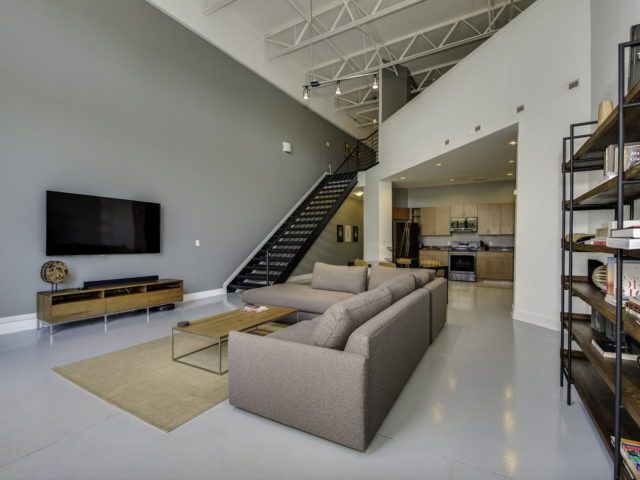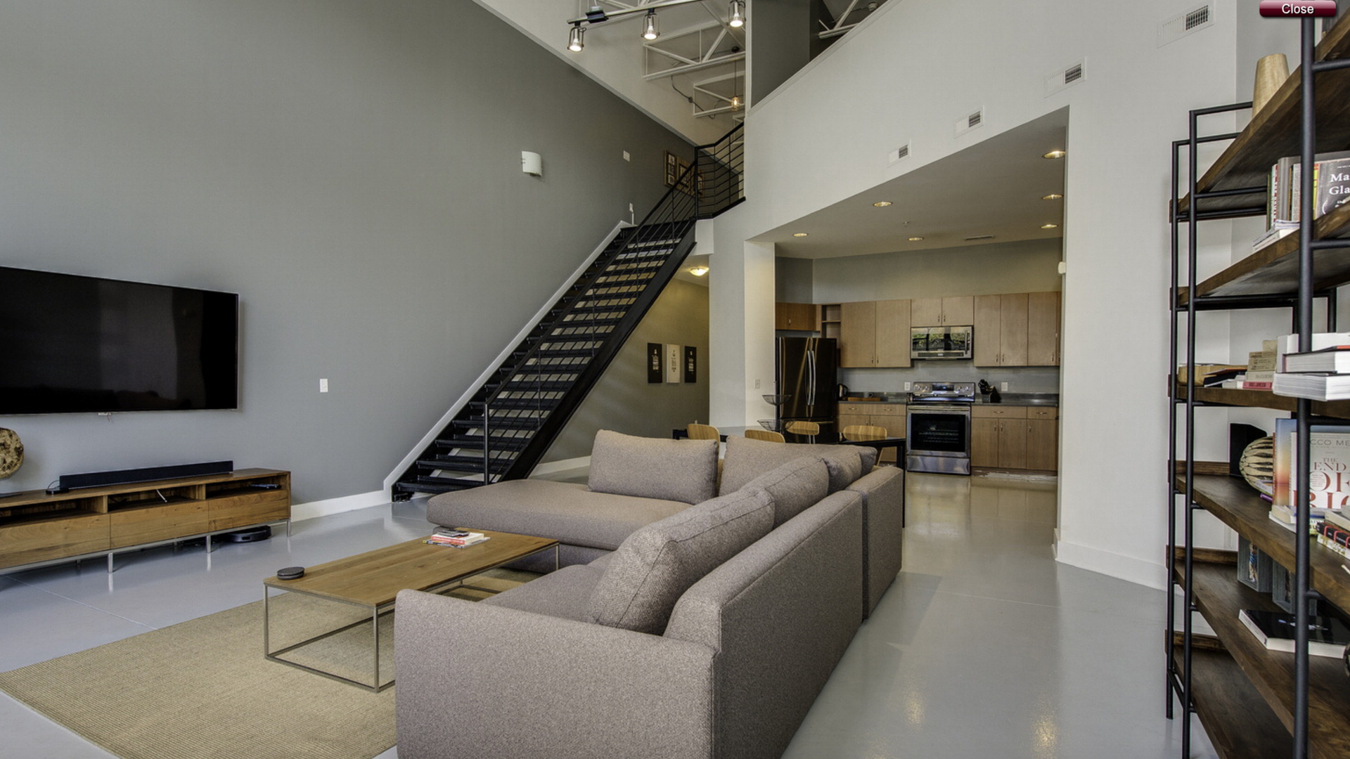 Spacious loft with newly finished concrete floors, lots of cabinet space, electronic windows, a back patio with separate entrance and a large upstairs master suite