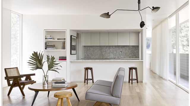 From the larch shiplap siding to the dramatic floor-to-ceiling windows and modern chic marble kitchen, this home is perfectly designed with a contemporary spin