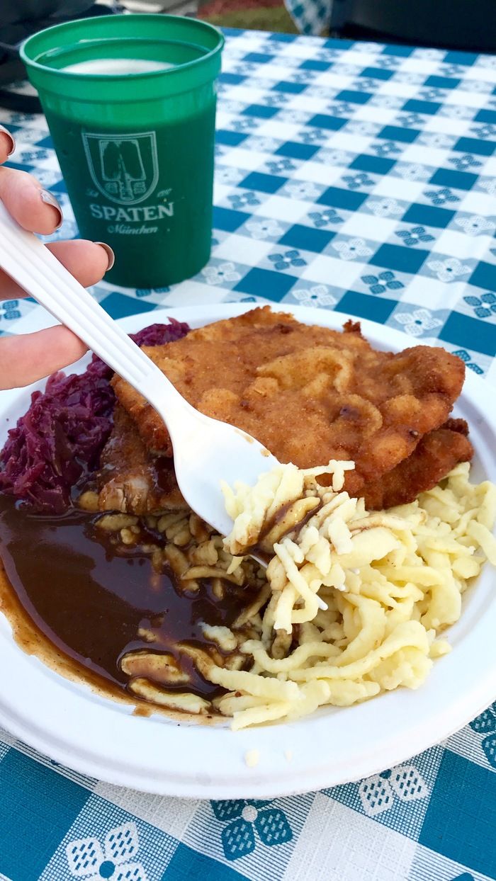 - What it is: Breaded pork cutlets with Spätzle and red cabbage.