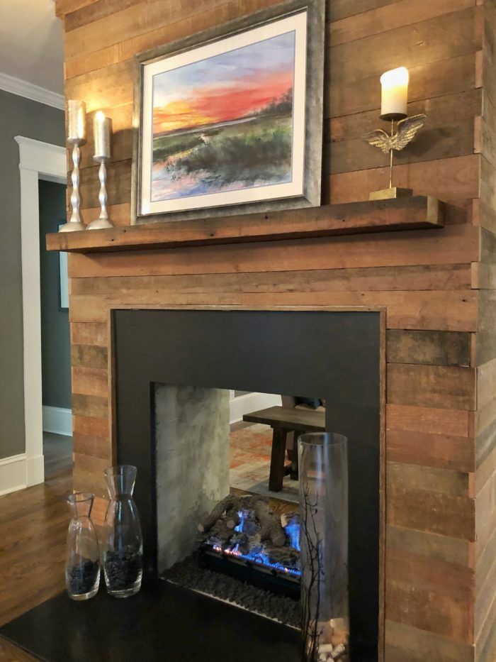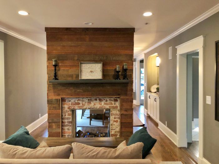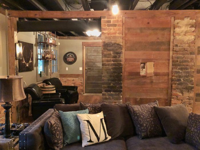 Natural charm: “Our builder and designer did an incredible job of maintaining the home’s character,” says Bailey of Peter Vasseur, the home’s builder and Craig Jackson, its designer. “They not only realized our ideas, but they brought in a lot of their own perspective and unique ideas.” The result? A home brimming with interesting details. The wood floors in the basement and the wood paneling over the fireplace is reclaimed pine from an 1842 South Carolina home that was owned by a Civil War general, and a 1927 brick stove in the basement—now behind the bourbon bar—is still in its original condition.
