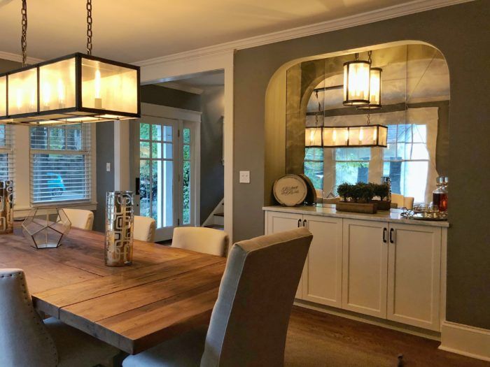 Top shops: The home features a variety of local touches—including an old beer barrel from Plaza Midwood brewery, Resident Culture, and a spirits barrel from local distillery, Doc Porter’s. The home’s furniture comes from a variety of stores such as Restoration Hardware (the dining table, chairs, and light fixtures), World Market (the sitting room sofa and wine bar chairs), and Nadeau (the foyer table and blue hutch in the basement).