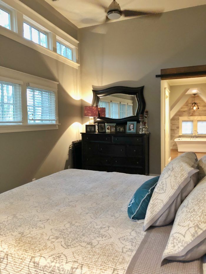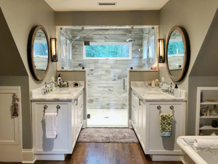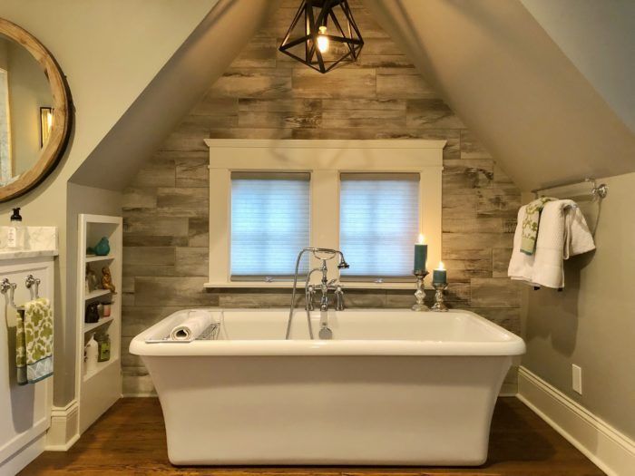 Treehouse shower: Originally, there was a sitting room area with a small deck off the upstairs master bedroom. When the home was renovated, that space became the luxurious master bathroom. The deck was closed in to create an oversized shower space with windows facing into the treetops. Tile that looks like old wood lines the walls, enhancing the rustic-meets-sophisticated look.