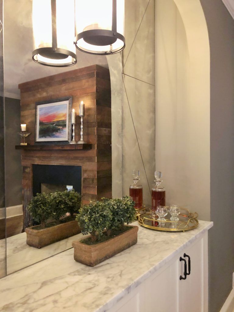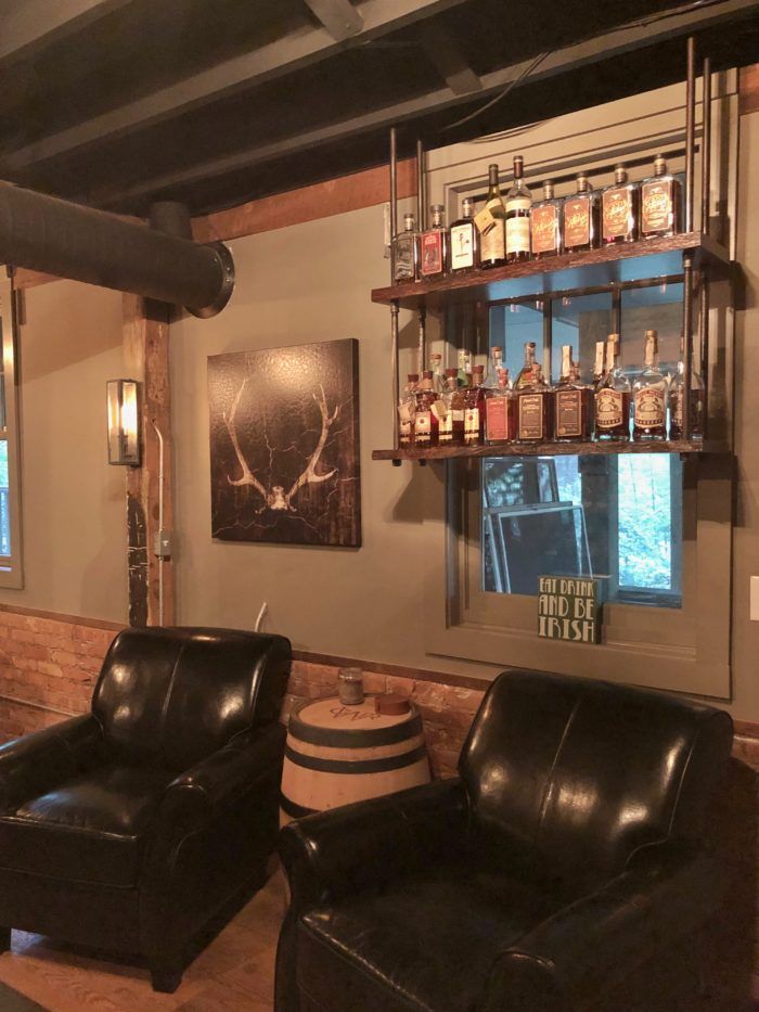 Into the woods: Morton’s father, John Wendorf, has done woodworking as a hobby for many years, building furniture and even custom cabinets for his friends. For the home, he used raw white oak wood from a South Carolina farm to craft the wine bar top and the shelves that hold the bourbon, giving the space a natural cozy feeling. “He made everything in South Carolina and brought it up here,” says Morton.