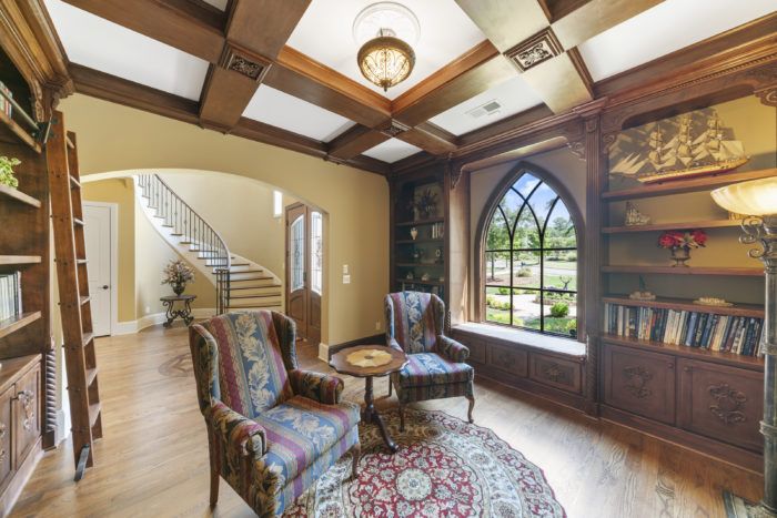 These features include: A two-story foyer, a grand spiral staircase with wrought iron balustrade, a library with mahogany accents, spacious custom closets, stone gas fireplace, an open floor plan and more.