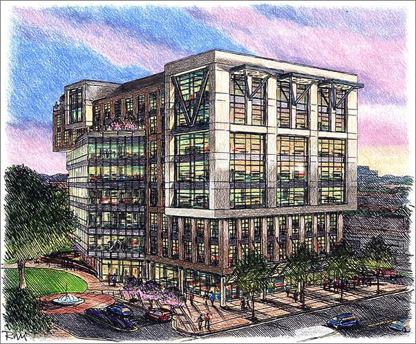 The office component will be 8 stories (4 stories wrapping a deck for apartments/hotel) and Beacon has been quietly working with existing landowners who are partnering on this beautiful project.