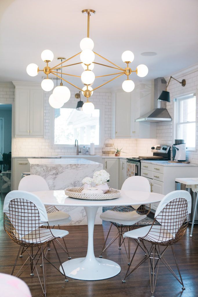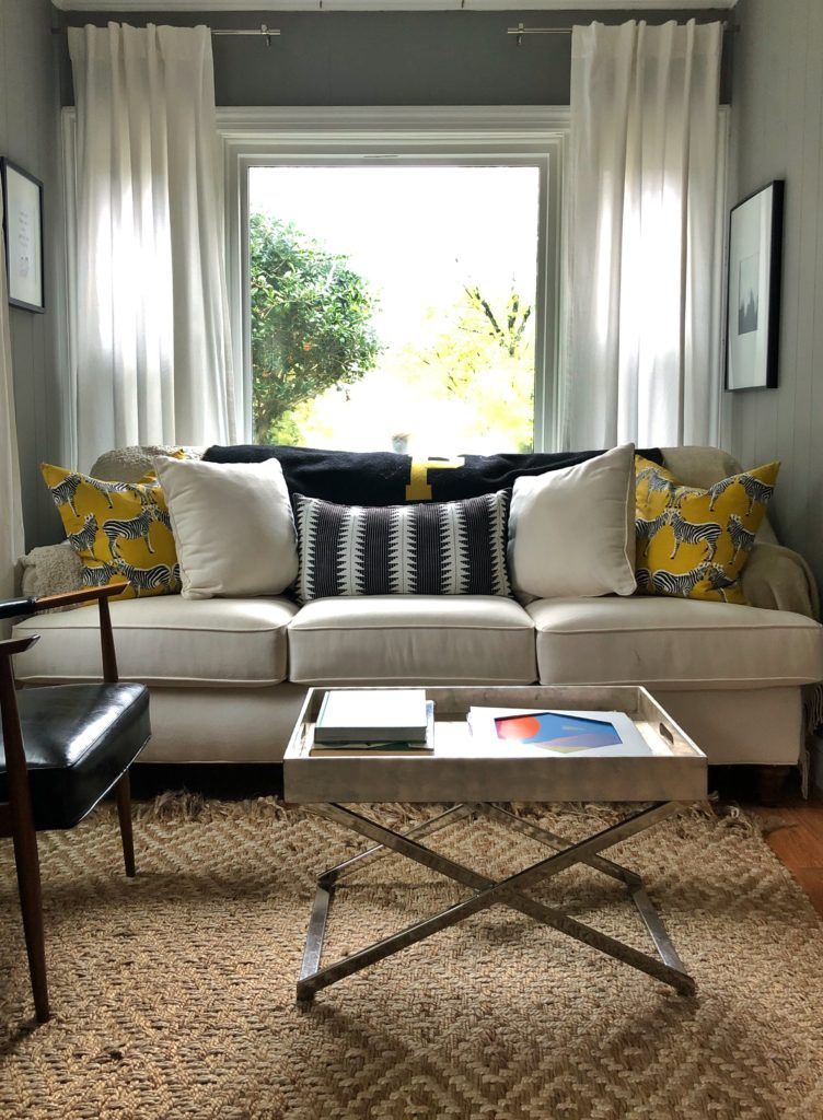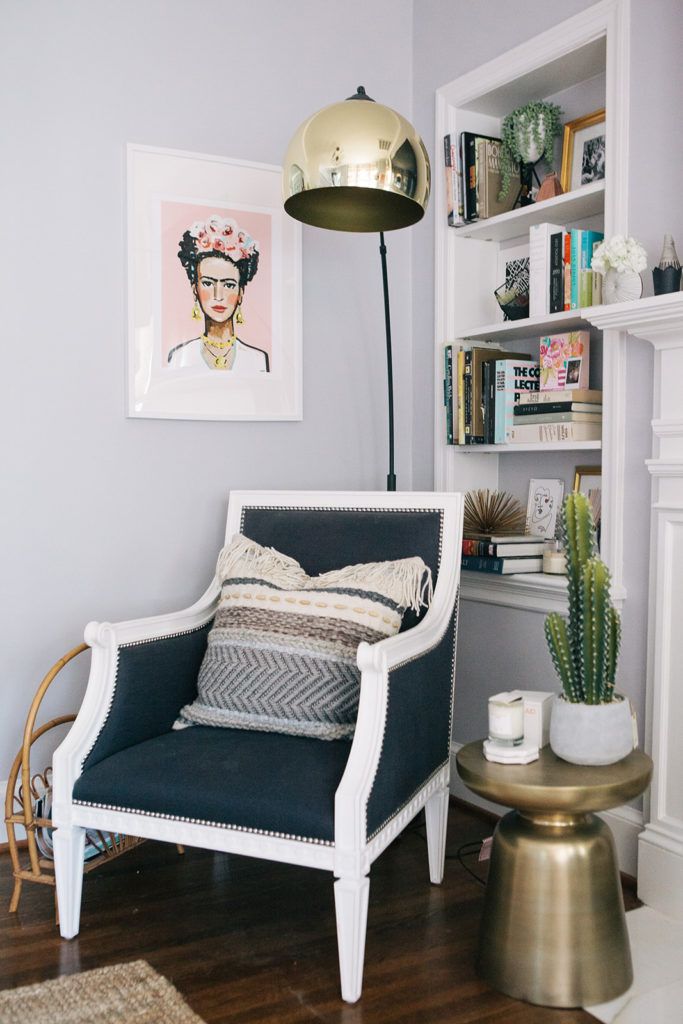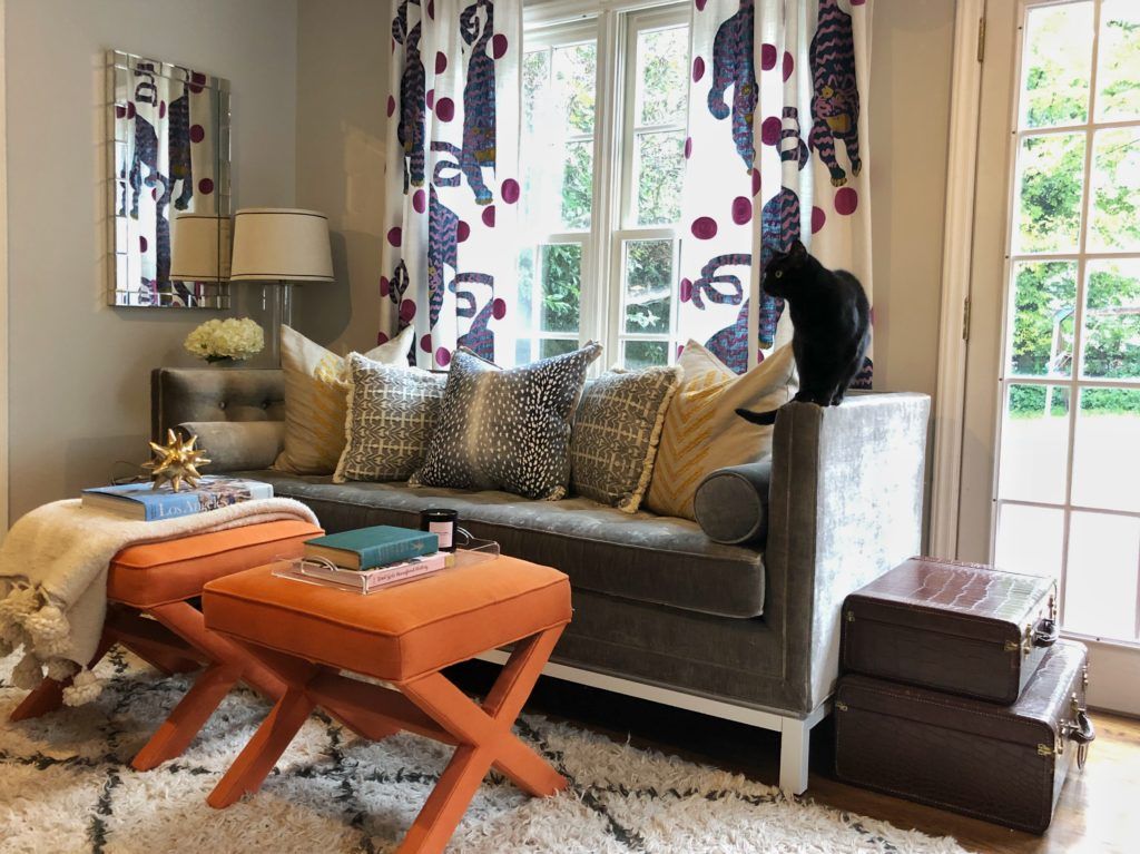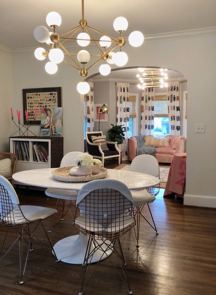 Top Shops: Sarah likes to shop at local spots like Plaza Midwood’s Slate Interiors and vintage shop, Dressing Room Interiors—”A lot of my art is from her.” But the home also features finds from designers, such as the Jonathan Adler chairs by the fireplace. The living room curtains are from Anthropologie, most of the rugs are Lulu and Georgia, and many of the light fixtures are from Wayfair.