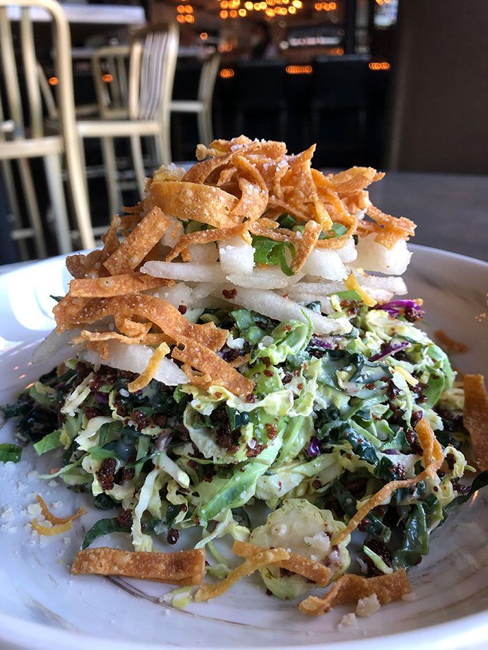 The kale and brussel salad topped with candied pecans, wanton chips, Korean pear and apple cider vinaigrette is easily one of the best salads I’ve had.