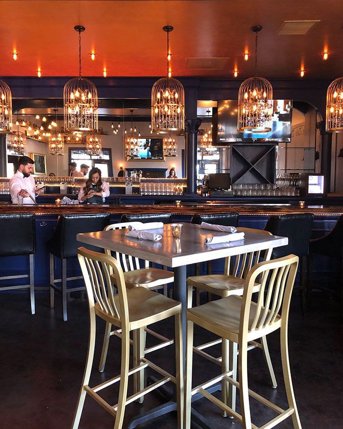 The bar, dripping in gold and crystal birdcage chandeliers, has lounge seating around the fireplace and a few high-top tables and booths. It also opens out to a patio with additional outdoor seating.