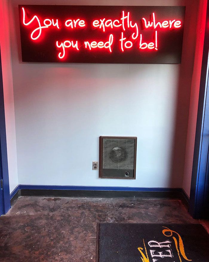 A pink neon sign greets you at the entrance with the words “You are exactly where you need to be.”