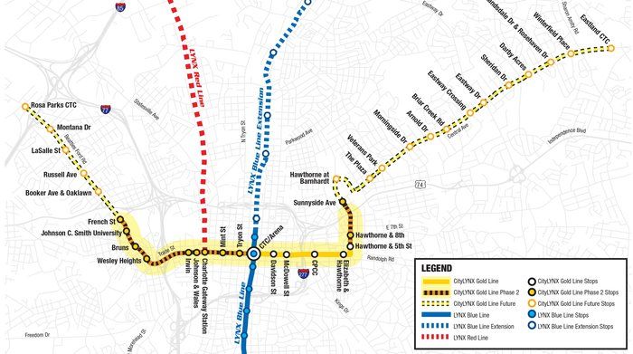 To the west, the second phase will finish crossing Uptown before running past Johnston & Wales University, then through Wesley Heights to Johnson C. Smith University.