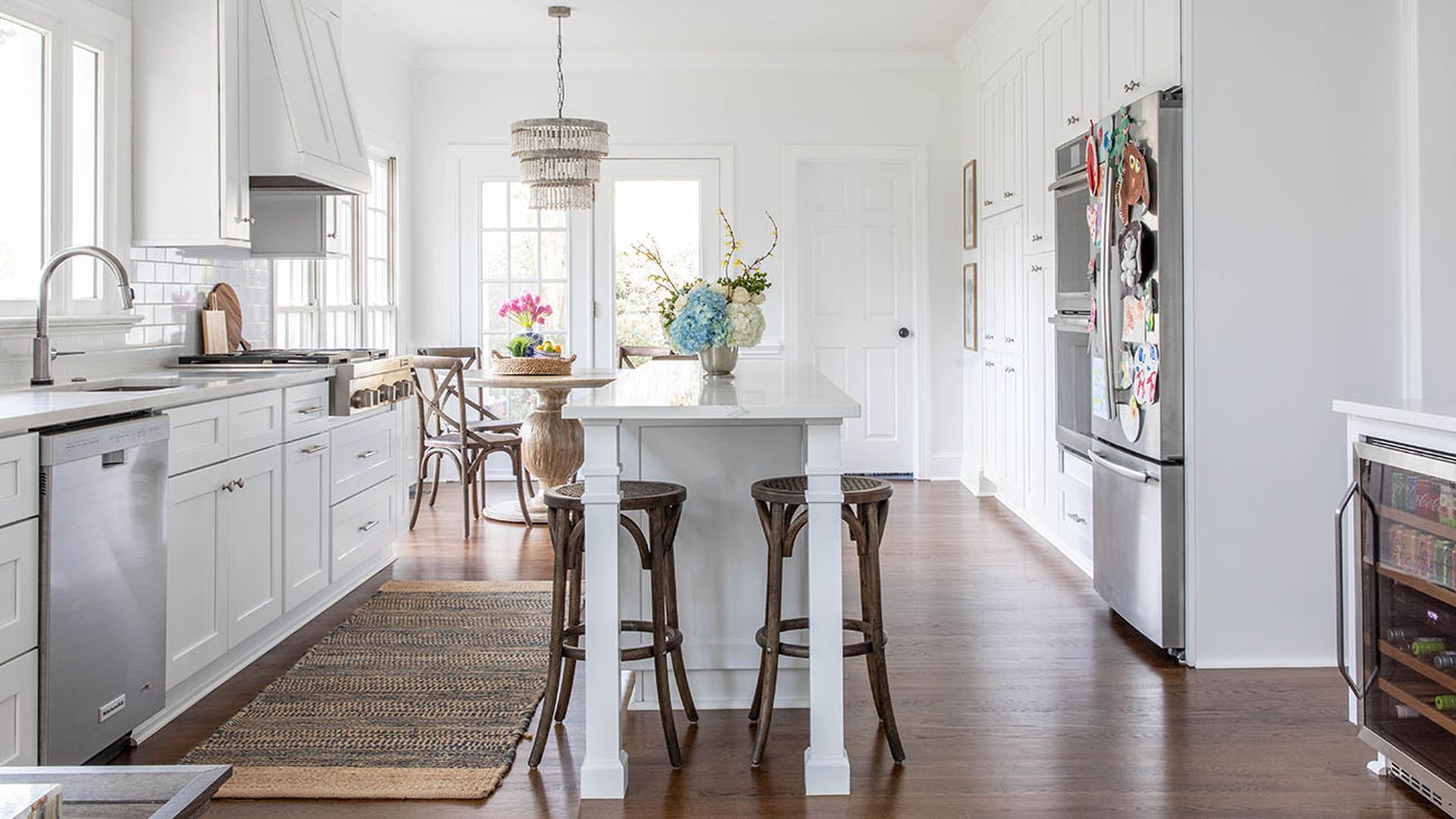 Cheerios, Goldfish and beer: The kitchen was a total overhaul (done by Atreum Construction) Christina said. They wanted the kitchen and living room to be one big family space since that’s where they spend the most time — and they love to entertain. So they restructured the kitchen, added in storage for all the Cheerios and Gold Fish and a beer tap (Matt’s favorite part of the house).