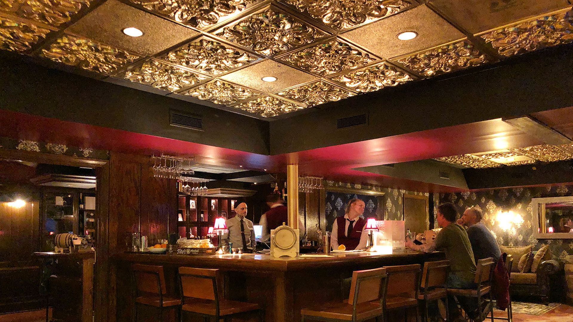 It’s a small, dark space with ornate gold ceilings, lounge seating and a central bar you can access from all sides.