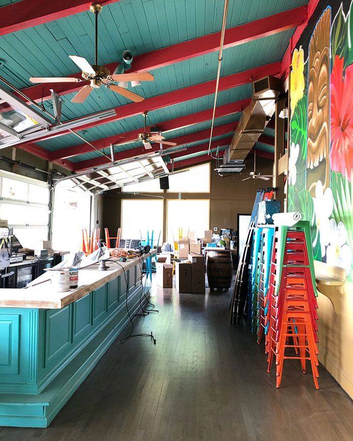 Tiki bar – Themed space with tiki hut booths, colorful murals, roll-up garage doors overlooking the water and an indoor/outdoor bar