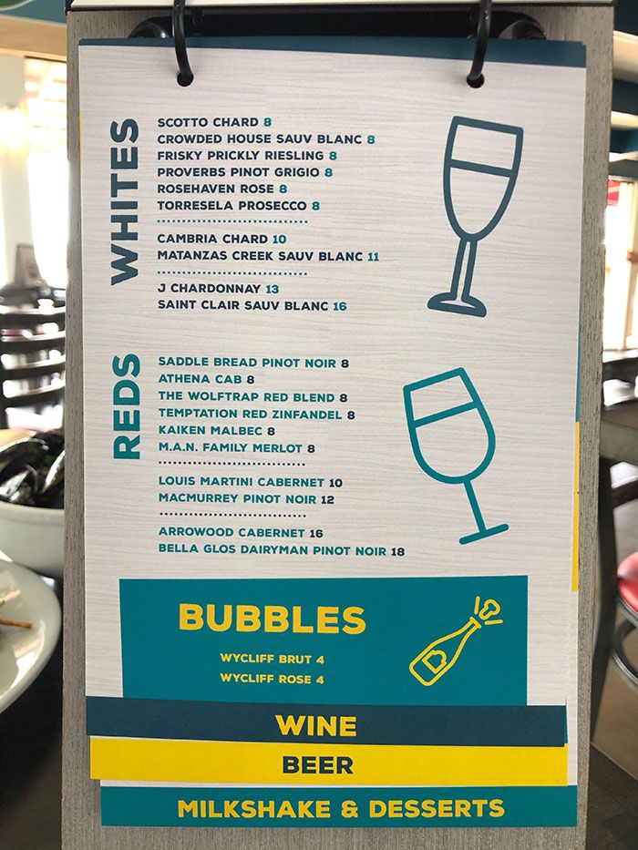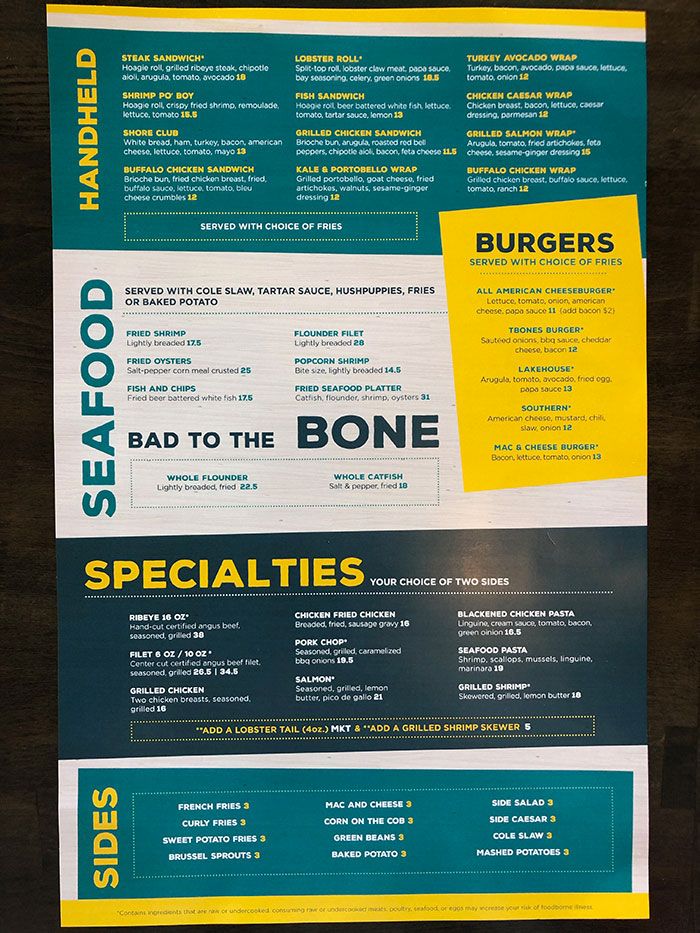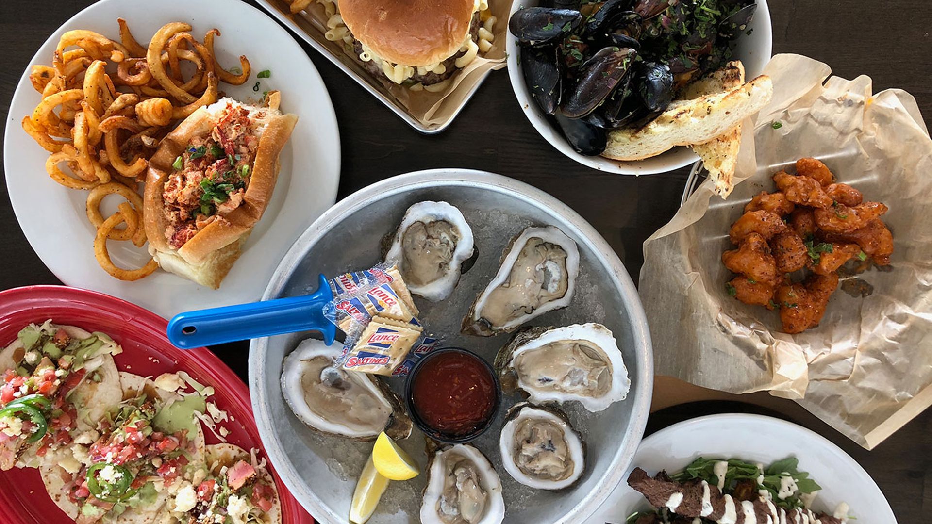 The extensive menu features steamed and fried seafood platters, oysters, burgers, salads, sandwiches, tacos and bar appetizers.