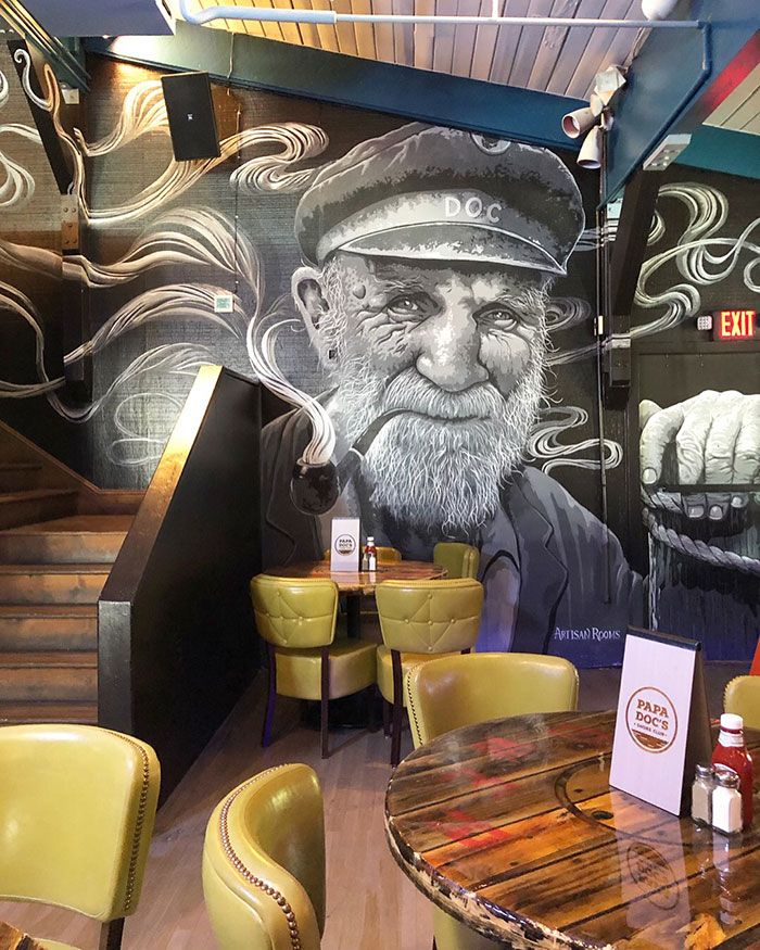 The Anchor – Dark, moody bar lounge with a huge Papa Doc mural by Artisan Rooms