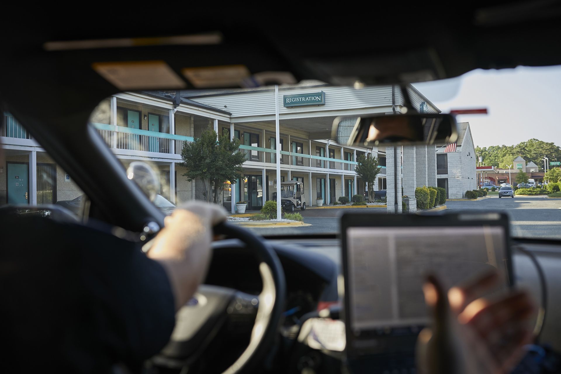 “See, look at that,” Ellis says as we ride through the Brookwood Inn parking lot. He’s pointing to a Ford Focus with its trunk facing the doors.