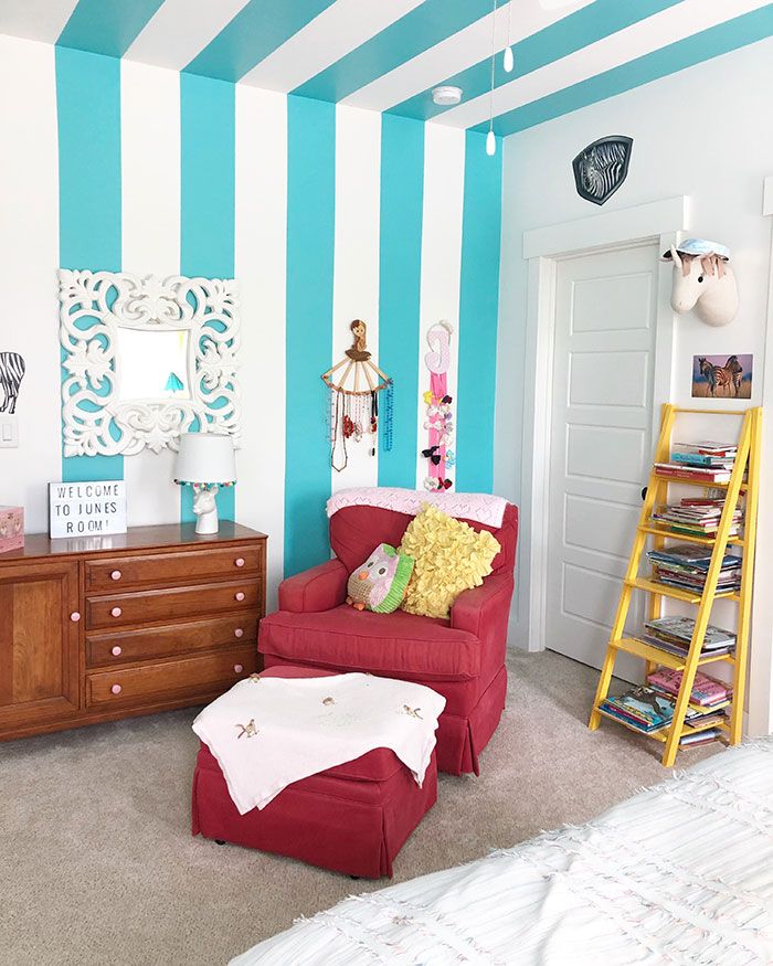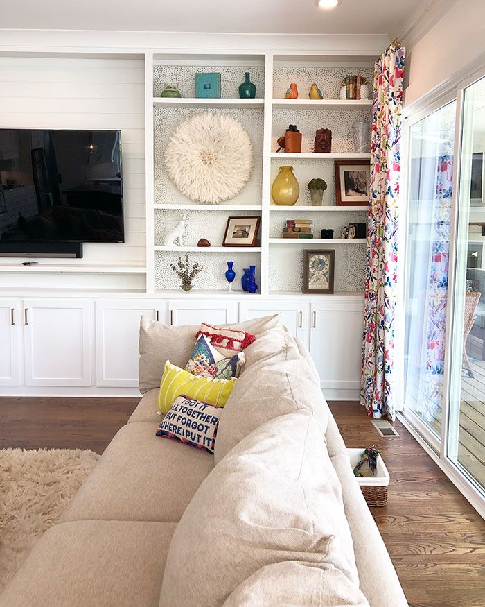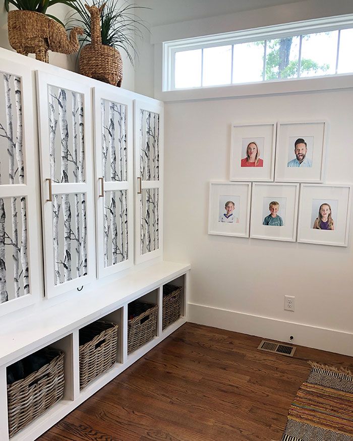 Smart Storage: Wall-to-wall custom built-ins in the living room combine open shelving for displaying unique treasures (like Page’s dried frog from her Peace Corps days in Honduras) and cabinets for hiding the rest. The same utility is at play in the mud room where the kids’ gear is hidden behind far more eye-pleasing birch tree wallpapered locker-style doors. Page says they also strategically built the home without a formal dining room or guest rooms to avoid creating unused space. Instead, a custom-built king-size hideaway bed by Tall Oak Builders and full bathroom make it possible to convert the playroom into a sizable guest suite only when needed.
