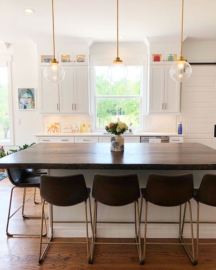 Custom Creations: Danielle McKim of TUFT in Charlotte created a number of custom pieces for the Fehlings, including their navy dining table, a reupholstered chair that belonged to Page’s grandmother and a coffee table created to fit perfectly with their enormous living room sectional. The custom kitchen island was made with reclaimed wood from Cope and Stick in Charlotte and the porch furniture is by Jake’s cousin’s husband at Oak City Carpentry out of Raleigh.
