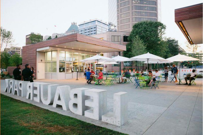 A similar example closer to home is LeBauer Park in Greensboro, a 4-acre park downtown with a performance area, iconic artwork, splash pad and playground, food pavilions and food truck parking.