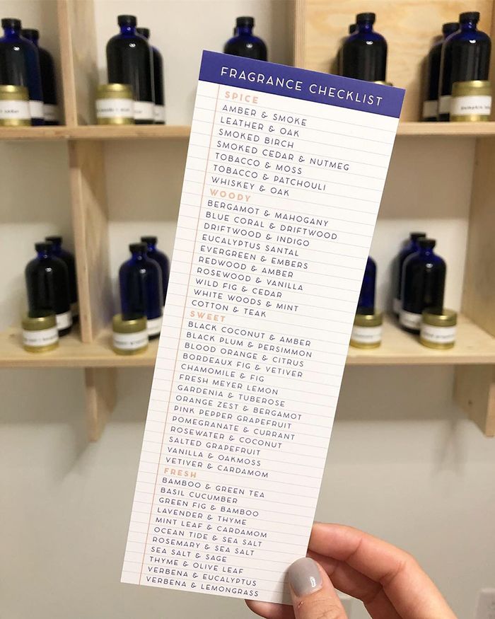 Select a fragrance: Choose from 40 scents. You’ll work your way down the wall smelling the gold tins and making notes on your fragrance checklist. Once you find one you love, take the blue bottle back to your work station.