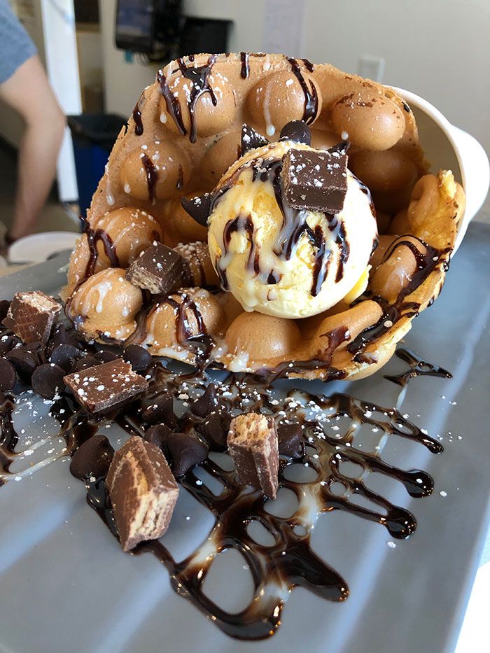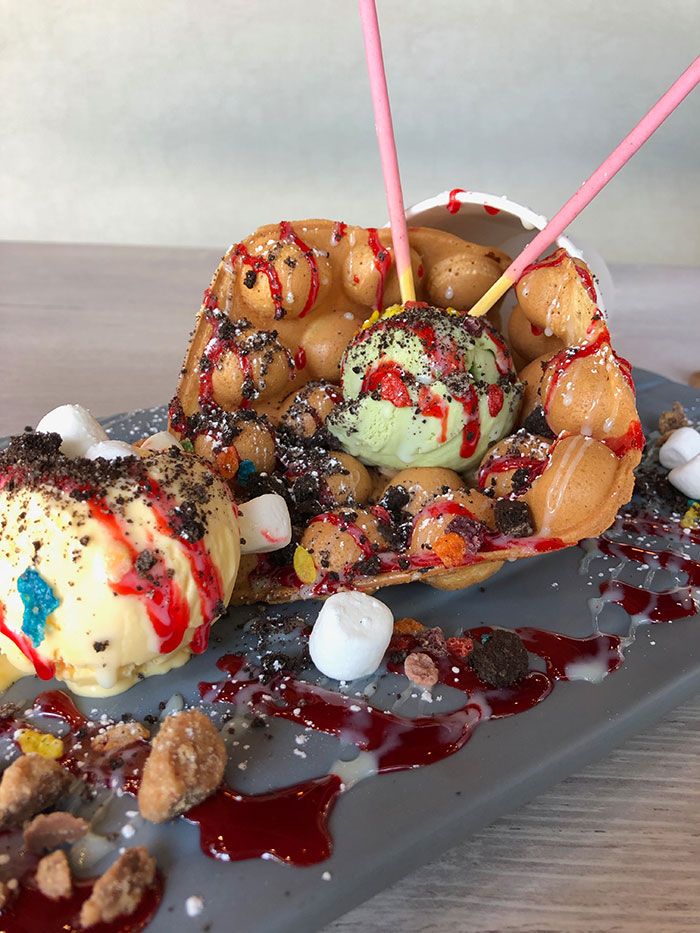 The eye-catching Hong Kong street food, also known as egg puffs or egg waffles, is an airy, made-to-order pancake-style cone filled with your choice of ice cream, toppings and drizzles.