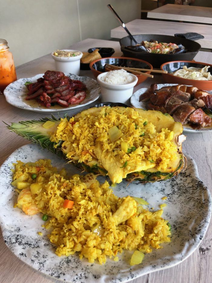 The roasted duck ($17.95 half/$32.95 whole) and char siu ($14.95), a Cantonese-style barbecued pork, are two popular shareable dishes my server said routinely sell out. And the large cast iron rice dishes ($16.95-$22.95) and the pineapple fried rice ($15.95) served in a hollowed pineapple half are showstoppers.
