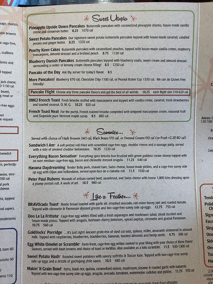 Pancake Flights: Can’t choose just one of their eight pancake options? Make it a flight and pick any three flavors, including pineapple upside down, sweet potato, blueberry danish, peanut butter cup and more.