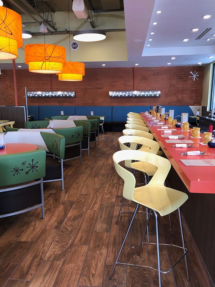 The colorful retro-inspired restaurant has about a dozen bar seats and a mix of booth and table seating inside along with a pet-friendly outdoor patio.