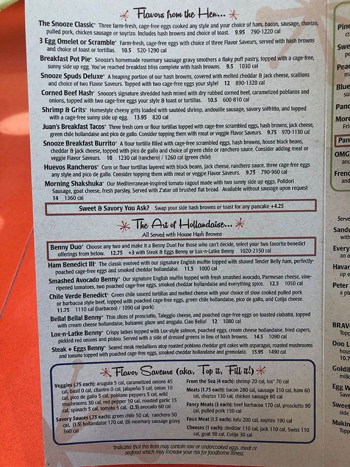 Calorie Conscious: You’ll either loves this or hate it but Snooze prints calorie counts for all menu items. You honestly may not want to know. Watching what you eat? The “Like a Feather” menu section has lighter options like avocado toast, sweet potato hash and a grain bowl.