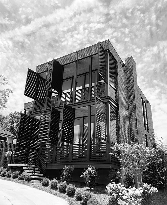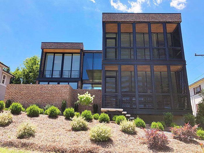 The Neighborhood: The home is located in the heart of Myers Park fronting the neighborhood’s main commercial thoroughfare on Providence Road with the rear portion of the lot falling within the Hermitage Court Historic District’s boundaries. Although undeniably modern, the home plays off the neighborhood’s aesthetic. From the architect: “Design elements, such as the two-story front porch, learn from the site’s historic neighbors. The use of Chicago brick and poured concrete will stand the test of time and lend a stately presence along Providence Road.”