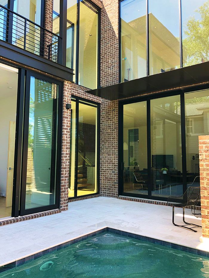 The result is a sleek, modern 2,965-square-foot Chicago brick home turning heads on Providence Road. The property features a two-story front porch, soaring 12-foot ceilings, floor-to-ceiling windows and two interiorized courtyards — one with a plunge pool and the other a garden — that marry indoor and outdoor living and allow natural light to cut deep into the interior.