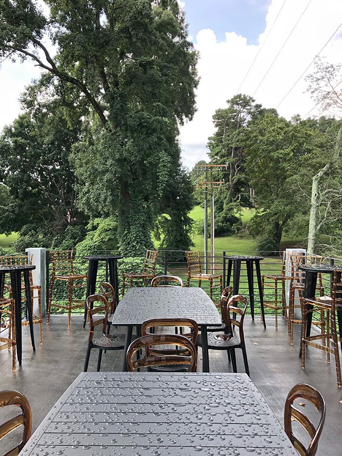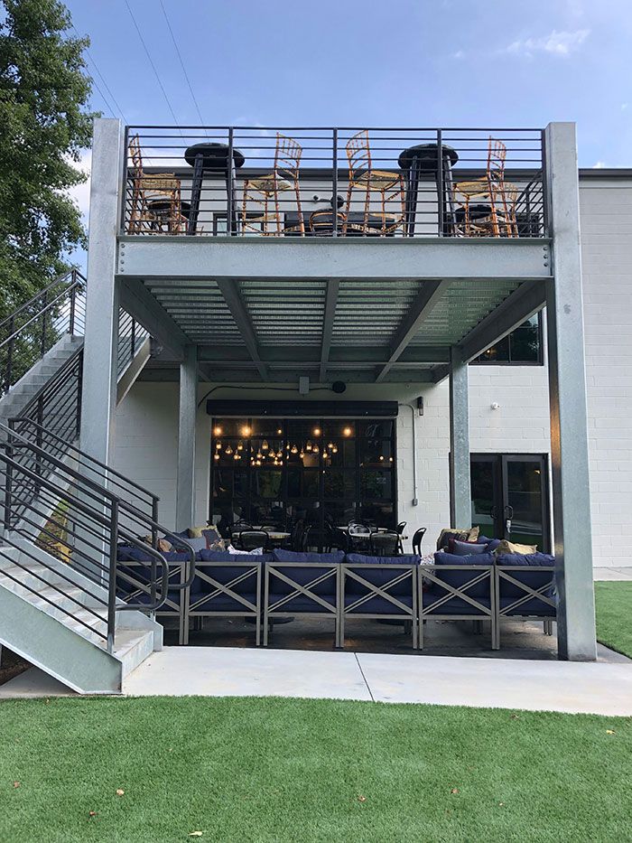 Layout: The two-story space features self-serve taps, a mix of lounge, high-top and table seating, roll-up garage doors and outdoor patios overlooking Veterans Park on both levels. The duckpin bowling lanes are in the basement which opens out to a spacious lawn and fireplace. The view from out back makes you feel so far away from Charlotte.
