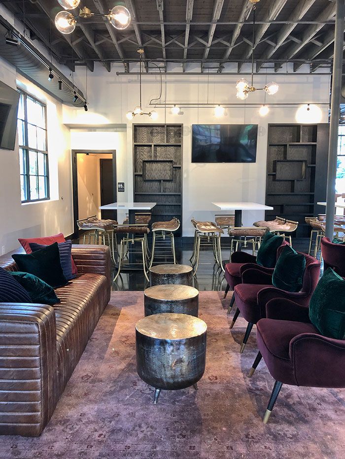 Interior design: The taproom has a distinct Gatsby-inspired design aesthetic with lots of gold, navy and burgundy, marquee-style lights and luxe textures like leather and velvet. Emilie Moseley and Rosarae Drury of Vignette Interior Design, the same team that designed Hoppin’, created the space. Standout decor features include a unique light fixture made of repurposed crystal decanters and the historic Midwood Cleaners sign repurposed and on display in the basement.