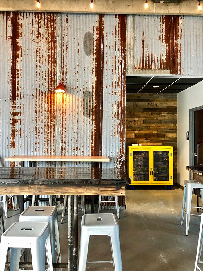 Lower Left’s taproom is about 900 square feet with seating for 45. The team worked with salvaged materials wherever possible, including wood slats from 111 pallets taken apart by hand, metal roofing from an old barn in Concord and custom handmade tables by Greg Ferrell.