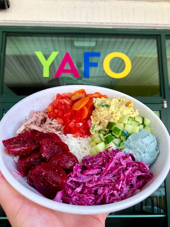 Yafo’s Rainbow Grain Bowl – They added spirulina, a blue-green algae, to create naturally colored blue hummus so you can build your own rainbow bowl.
